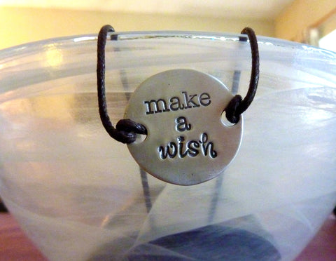 This disc bracelet embossed with 'Make a Wish' measures approximately an inch diameter and is made from Fine Silver.  The bracelet is made from waxed cotton and the size can be easily adjusted with the sliding knot, so it will fit any wrist.