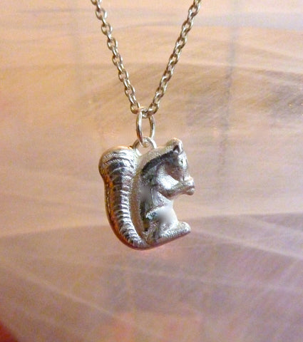 This squirrel with nut is handmade from .999 Fine Silver and measures approximately 1.5cm. It hangs from an 18" Sterling Silver curb chain.