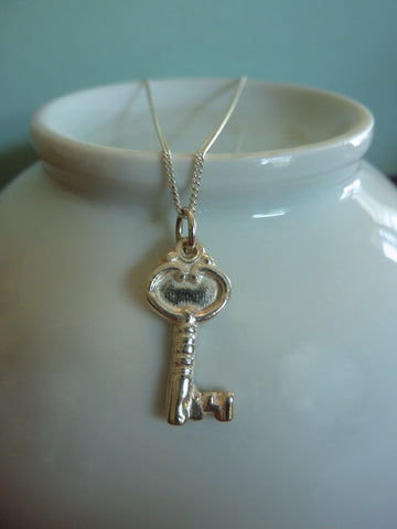 This miniature key is handmade from .999 Fine Silver, which is purer than Sterling Silver, and hangs on a 18" Sterling Silver curb chain necklace. Matching earrings available.