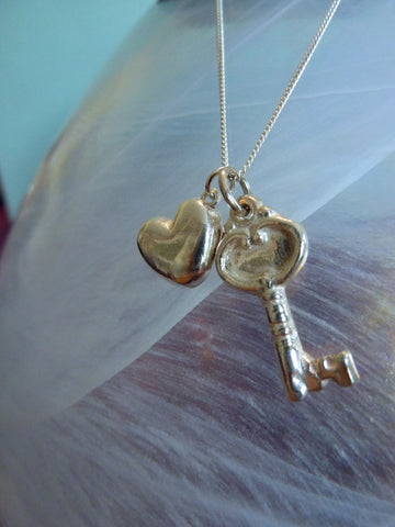 This sweet pair of a key and heart have been handmade from .999 Fine Silver, which is purer than Sterling Silver, and is hanging on a 50cm round black leather necklace with Sterling Silver clasp. Matching earrings available.