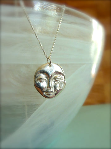 This little face has a cubic zirconia tear sparkling on its cheek. It measures approximately 3/4" and has been handmade from .999 Fine Silver, which is purer than Sterling Silver. It hangs from an 18" Sterling Silver Curb chain.