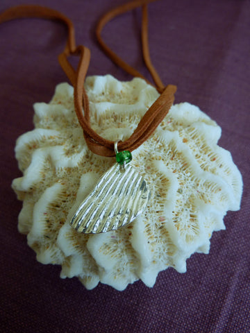 This grooved shell has been handmade from .999 Fine Silver, which is purer than Sterling Silver, and is perfectly paired with a green glass bead. It hangs on a sterling silver chain. It has been created using a real shell collected from the beach.
