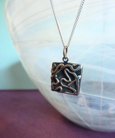 Squiggly square made from .999 Fine Silver, which is purer than Sterling Silver, hanging on an 18" Sterling Silver curb chain necklace. The design has been made by hand-syringing silver and then oxidising the pendant to give it an antique effect. The square measures approximately 1/2".